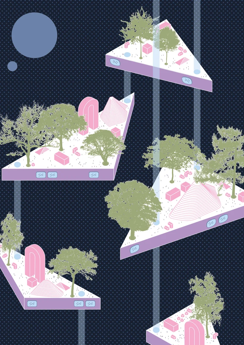 Trois représentations de jardins dans l'espace. S'extraire de la terre, prendre l'air dans l'univers, sentir, ressentir le vide. Errer dans le néant, flâner dans le cosmos, se promener en hauteur.