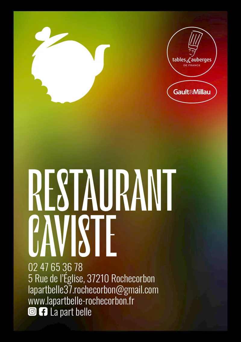 Carte de visite pour La Part Belle, un restaurant et caviste dans le centre de Rochecorbon (37210). La terrasse est une partie importante de l'établissement, colorée, donnant sur un jardin.