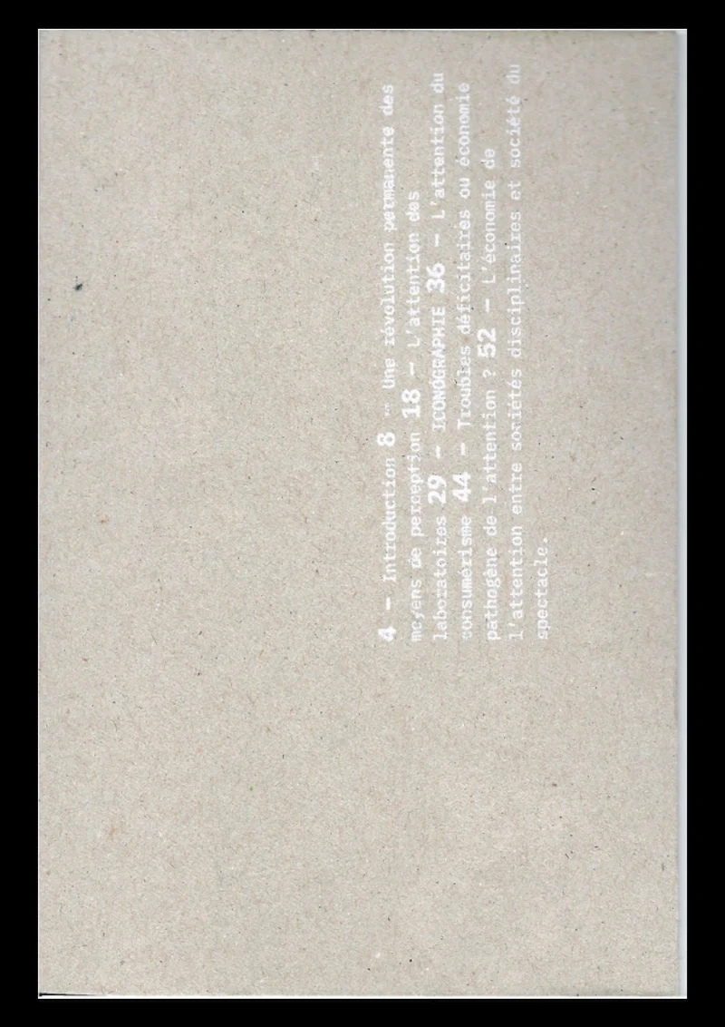 Mise en page du texte de Jonathan Crary. Parallèle entre ce texte, l'architecture et la phénoménologie. La couverture est en carton bois sérigraphié, outil utilisé dans les maquettes d'architecture.