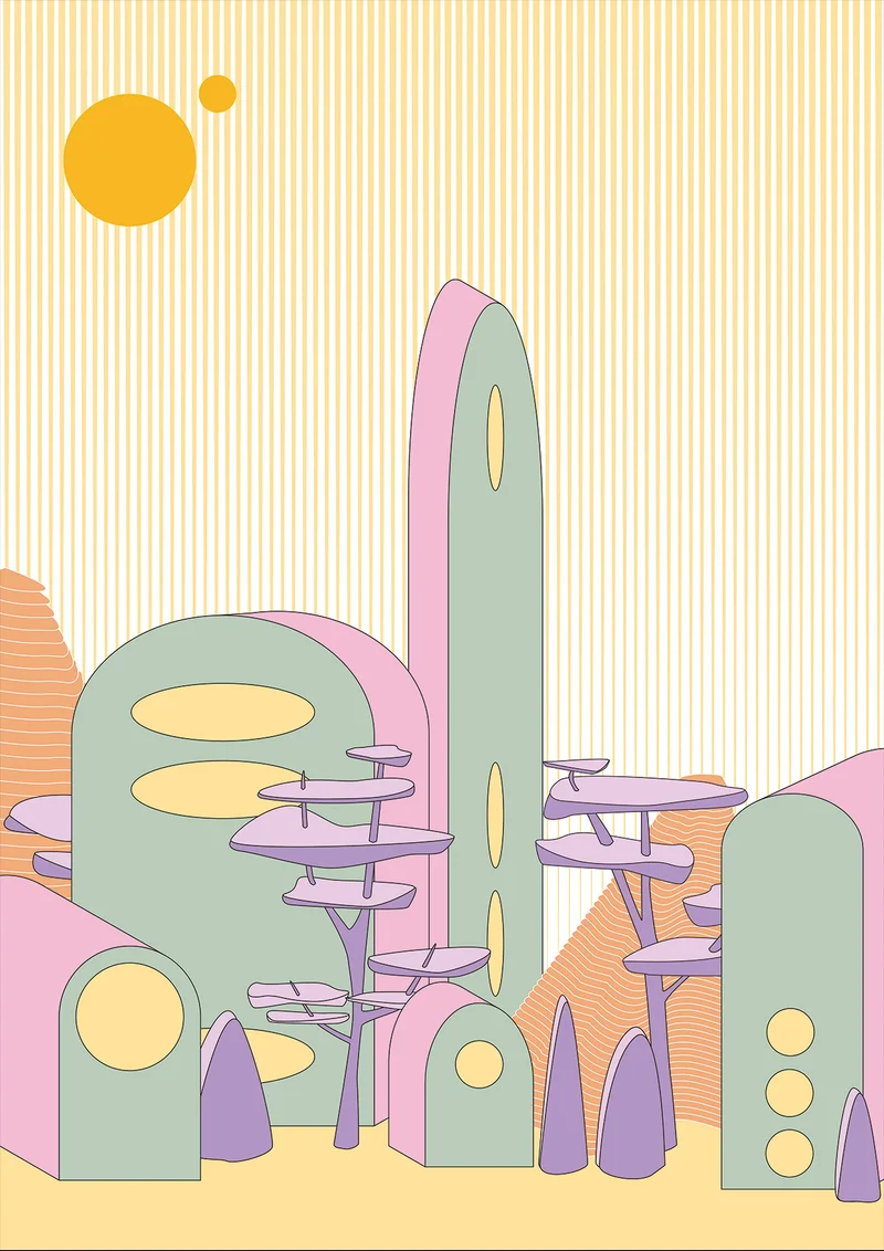 Métaphysique city s'inspire du mouvement italien Peinture métaphysique des années 1920, incarné entre autre par Giorgio de Chirico. Une ville pastelle, une pause dans le temps, la métaphysique du lieu.