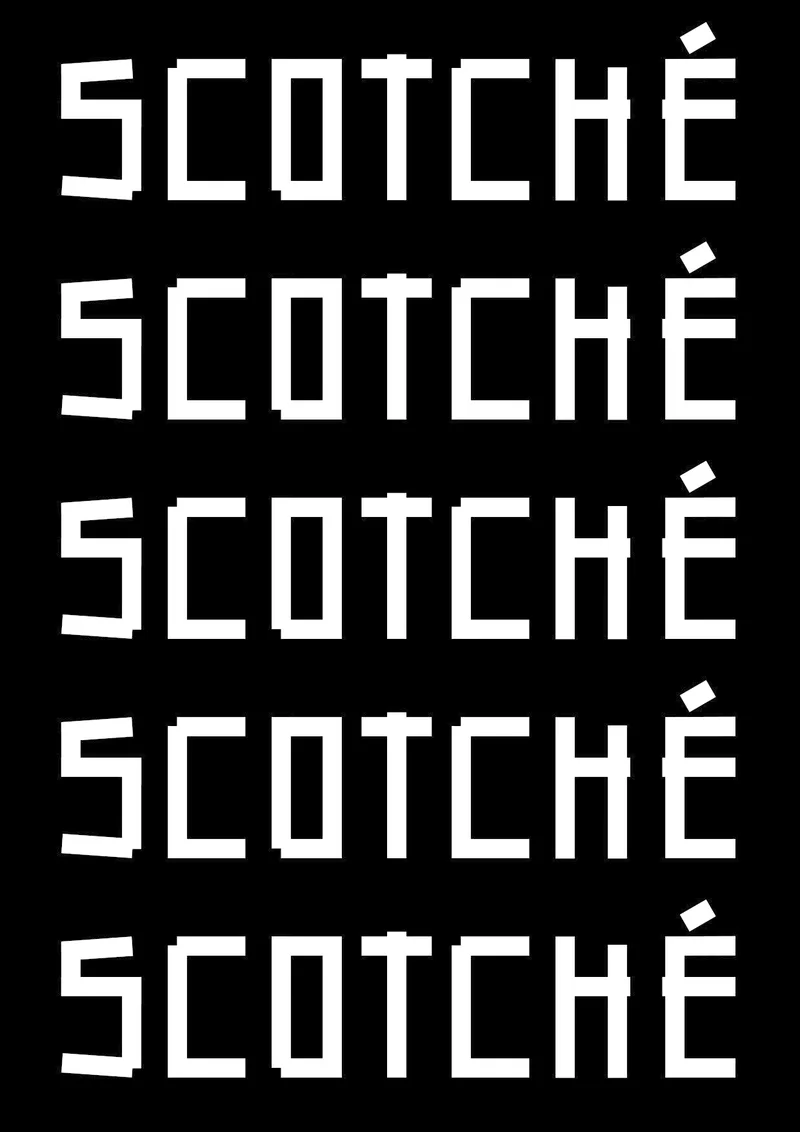 Scotché est une typographie display inspirée du scotch. La typographie reprend les accidents, les décalages, les trous qui se forment lors de cette pratique.